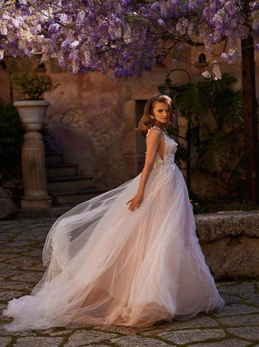 Classic & Simple A-Line Wedding Dresses V-Neck Sleeveless Appliqued Tulle Sweep Train Bridal Gowns