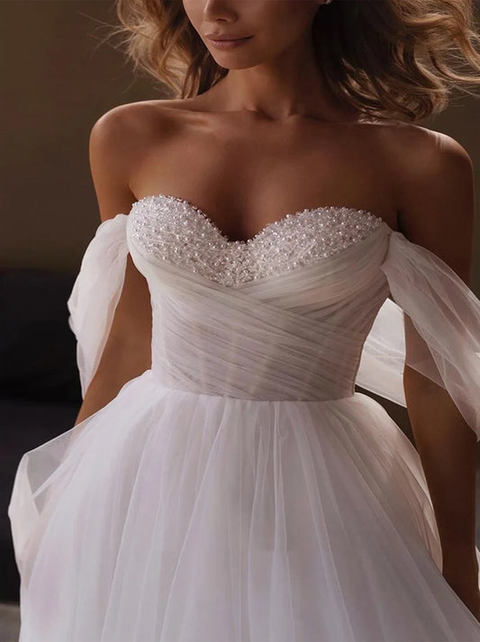 Classic & Simple A-Line Wedding Dresses Sweetheart Sleeveless Beads Tulle Sweep Train Bridal Gowns