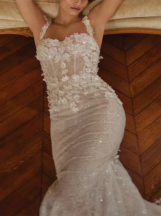 Classic Mermaid Wedding Dresses Sweetheart Appliqued Sequins Tulle Bridal Gowns Custom Made With Sweep Train