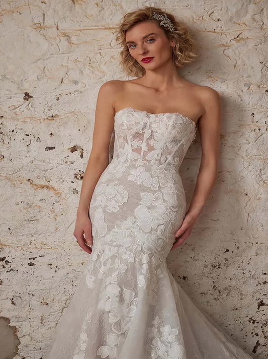 Classic Mermaid Wedding Dresses Sweetheart Appliqued Tulle Bridal Gowns Custom Made With Court Train
