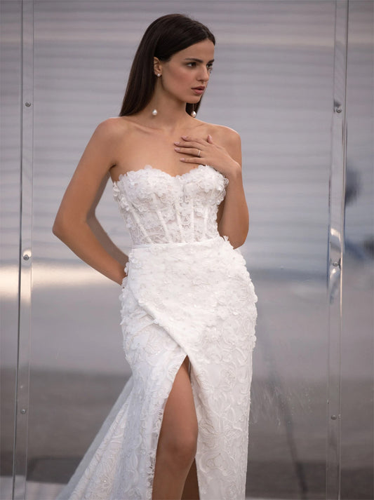 Elegant & Classic A-Line Beach Wedding Dresses Strapless Sleeveless Lace Court Train Bridal Gowns Custom With Pockets