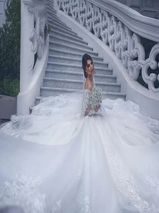 Luxury Ball Gown Wedding Dresses Long Sleeves Beaded Tulle Lace Crystal Sweep Train Bridal Gown