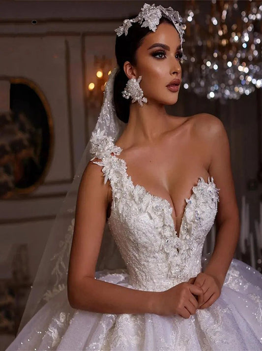 Sparkling Ball Gown Wedding Dresses One Shoulder Beads Appliques Sequins Tulle Sweep Train Bridal Gowns Custom Design