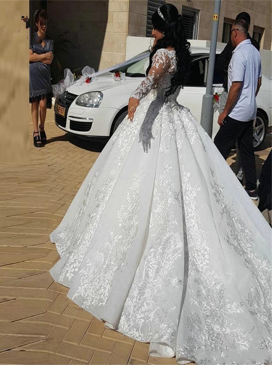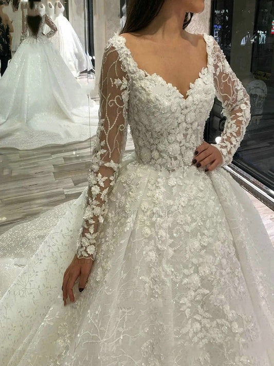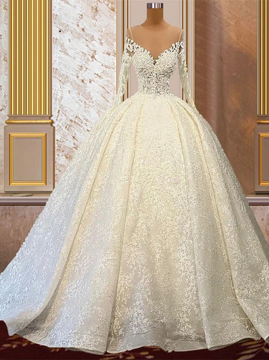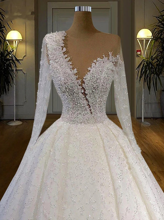Luxury Ball Gown Wedding Dresses V-Neck Beads Appliques Illusion Long Sleeves Lace Up Court Train Bridal Gowns Custom Design