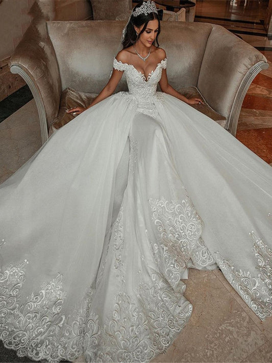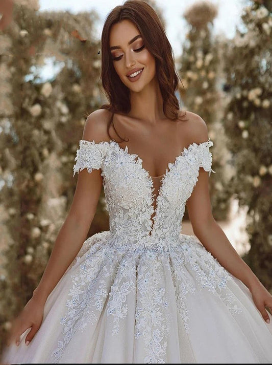 Elegant A-Line Wedding Dresses Off The Shoulder Cap Sleeves Beads Appliques Lace Up Court Train Bridal Gowns