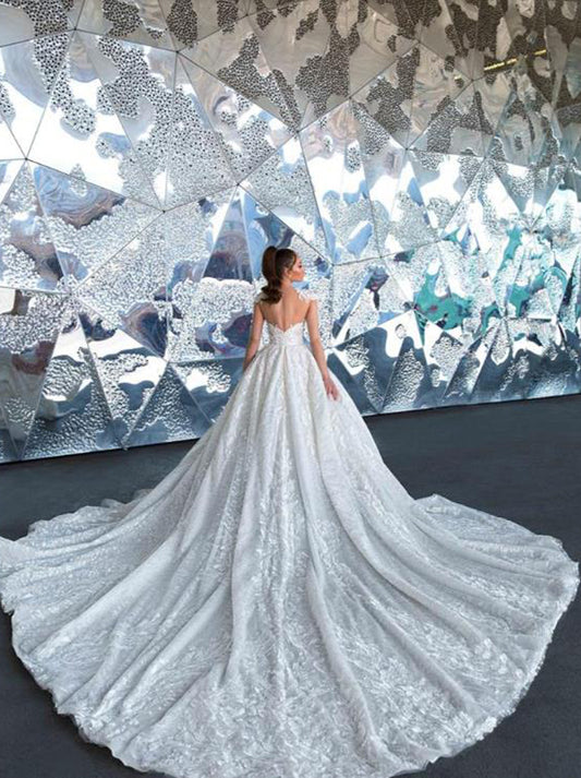 Luxury A-Line Wedding Dresses Jewel Sweetheart Cap Sleeves Zipper Court Train Lace Appliques Bridal Gowns Custom Made