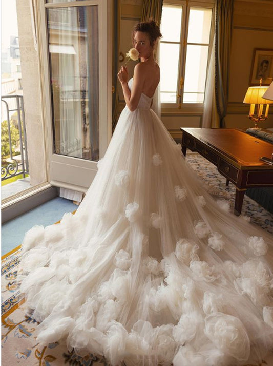 Simple & Elegant Ball Gown Boho Wedding Dresses Sweetehart Pleated Handmade Flowers Tulle Court Train Bridal Gowns