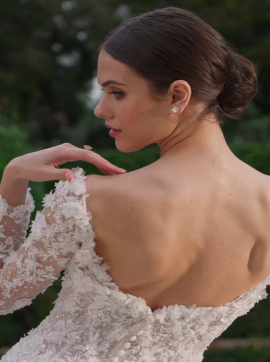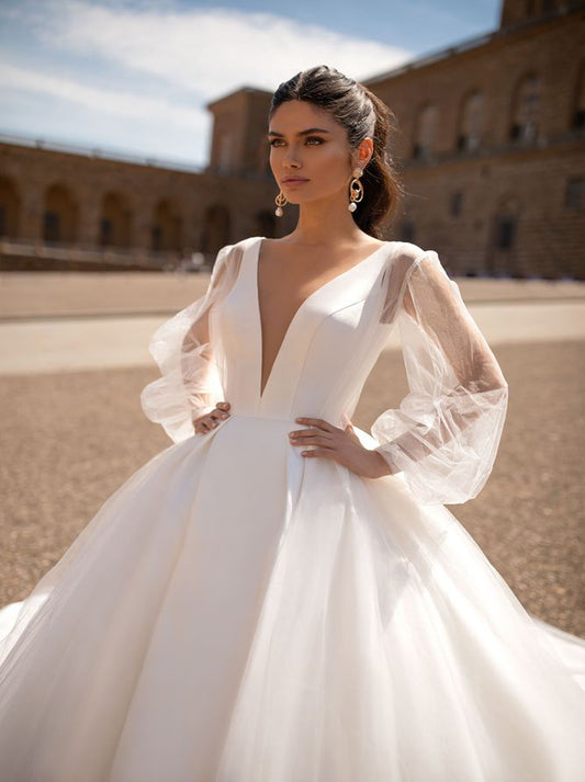 Elegant & Simple Ball Gown Wedding Dresses V-Neck Pleated Long Sleeves Satin Court Train Bridal Gowns