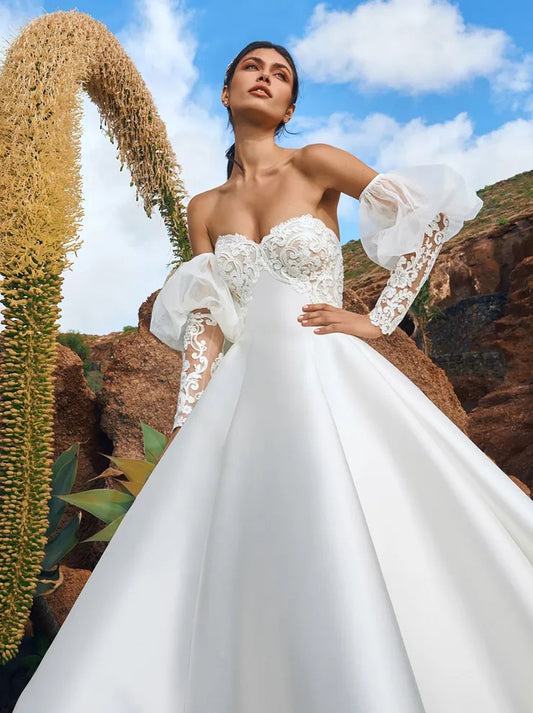 Elegant & Simple Ball Gown Wedding Dresses Sweetheart Detachable Long Sleeves Sweep Train Satin Bridal Gowns