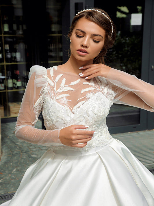 Charming Ball Gown Wedding Dresses V-Neck Appliqued Long Sleeves Tulle Sweep Train Satin Bridal Gowns Custom