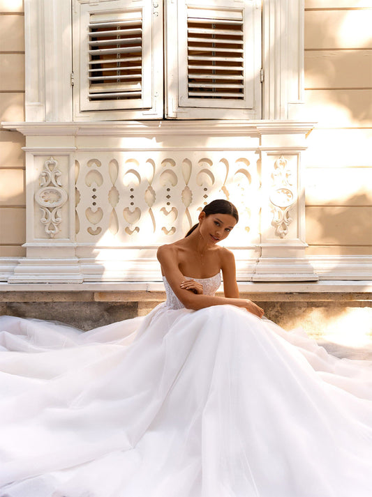 Modern Ball Gown Wedding Dresses Strapless Appliqued Sequins Tulle Sweep Train Bridal Gowns Custom