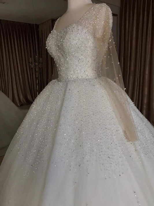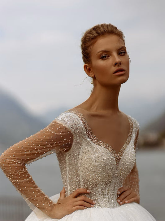 Sparkling Ball Gown Wedding Dresses Sweetheart Beads Sequins Illusion Long Sleeves Sweep Train Tulle Bridal Gowns Custom Made