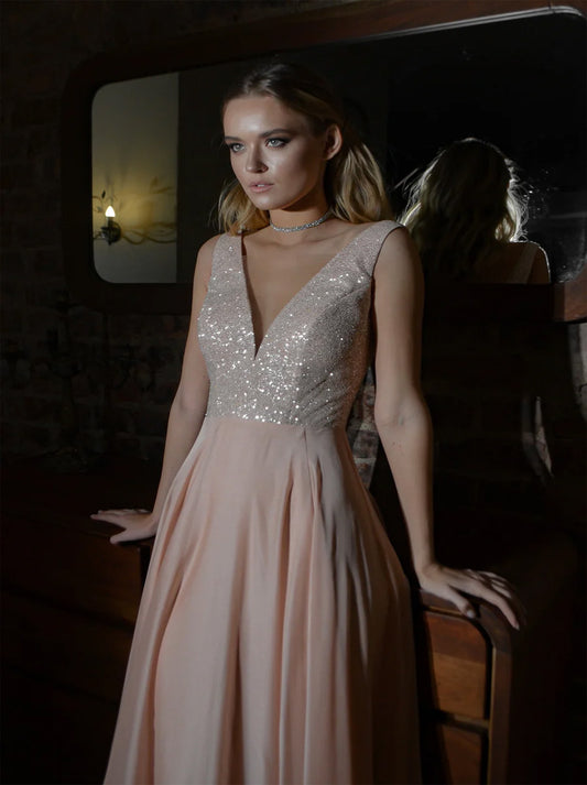Sparkling A-Line Wedding Dresses V-Neck Sequins Sleeveless Zipper Floor Length Bridal Gowns Custom Made