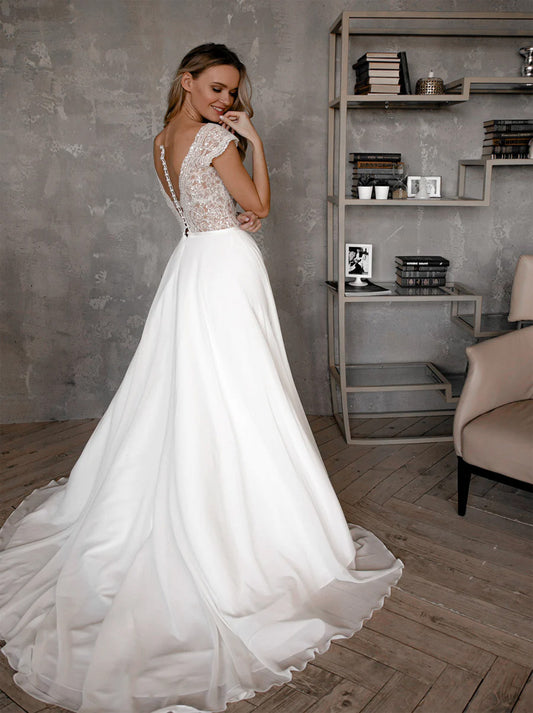 Simple A-Line Wedding Dresses Scoop Cap Sleeves Appliques Pleated Side Slit Buttons Chiffon Sweep Train Bridal Gowns For Women