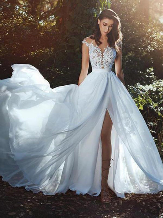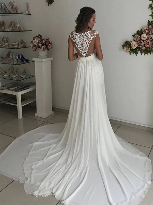 White A-Line Wedding Dresses Illusion Scoop Cap Sleeves Appliques Lace Chiffon Sweep Train Bridal Gowns Custom Made