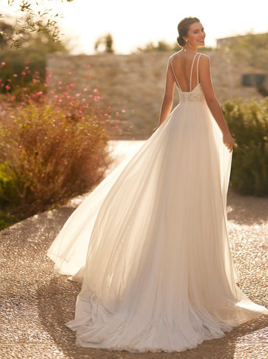 Simple Beach A-Line Wedding Dresses Spaghetti Pleated Side Slit Backless Sweep Train Chiffon Bridal Gowns Custom Design