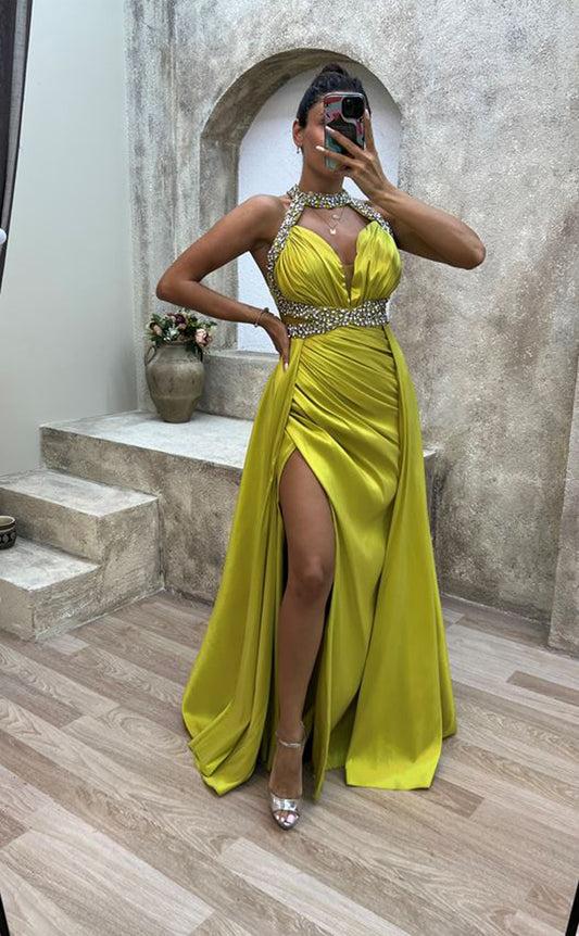 RP1568-Gorgeous Yellow Mermaid Halter Beaded Sleeveless Satin Prom Evening Dresses Formal Party Gowns With Slit
