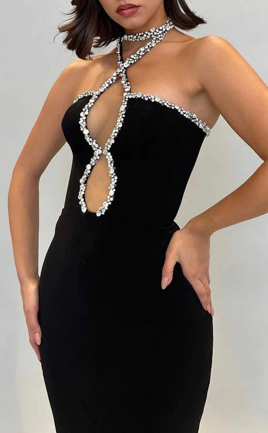RP1527-Unique Black Mermaid Halter Crystals Sleeveless Satin Prom Evening Dresses Formal Party Gowns