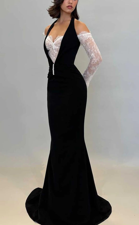 RP1350-Unique Black Mermaid Halter Lace Long Sleeves Prom Evening Dresses Formal Party Gowns With Train