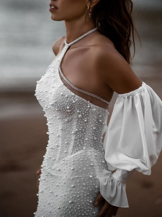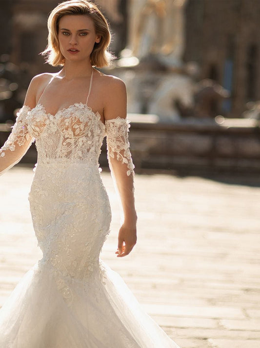 Elegant Mermaid Wedding Dresses Halter Beads Appliqued Detachable Long Sleeves Tulle Sweep Train Bridal Gowns Custom