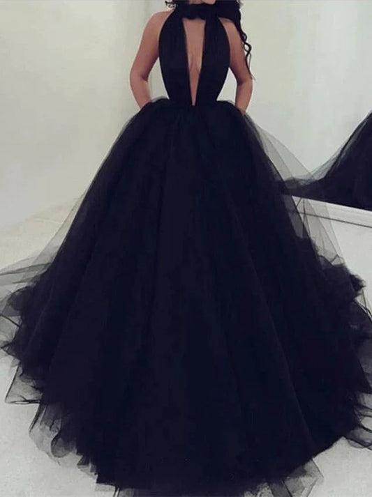 Sexy Black Ball Gown Wedding Dresses Halter Pleated Sleeveless Backless Tulle Sweep Train Bridal Gowns Custom Made