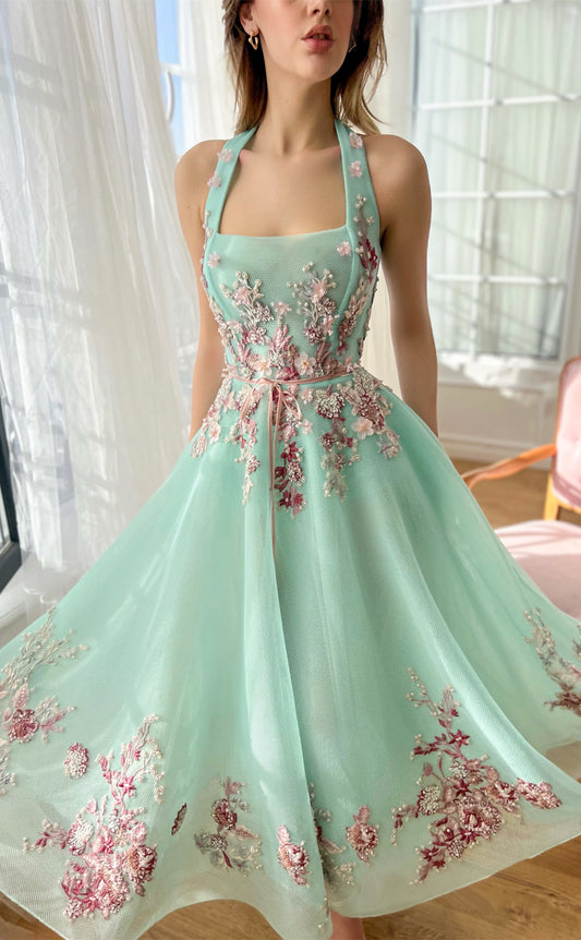 RP159-Mint A-Line Halter Appliqued Tea Length Prom Evening Dresses Formal Party Gowns