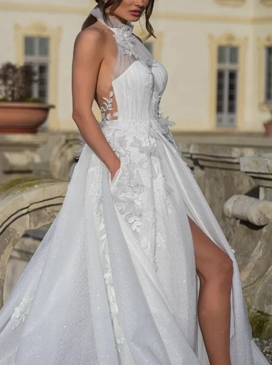 Classic A-Line Wedding Dresses Halter Sleeveless Appliqued Tulle Sweep Train Bridal Gowns Custom Made With Slit