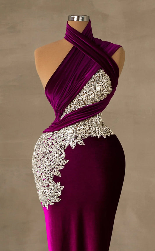 RP224-Elegant Mermaid Halter Beads Crystals Velvet Long Prom Evening Dresses Formal Party Gowns