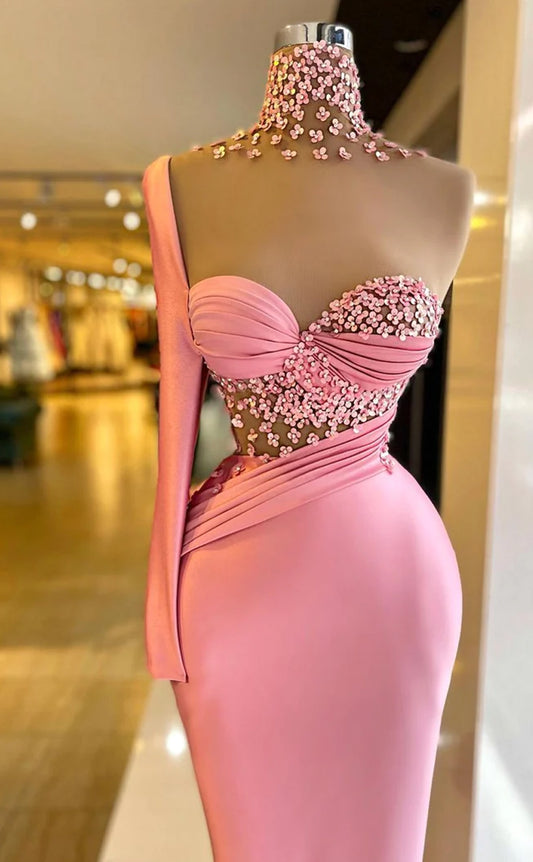 RP358-Gorgeous Pink Mermaid High Neck Pleated Sequins One Long Sleeve Prom Evening Dresses Formal Party Gowns