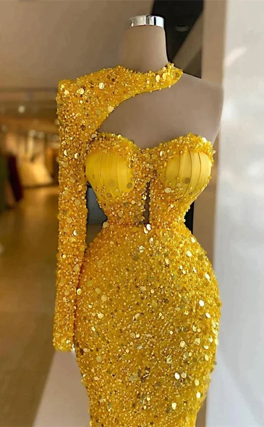 RP371-Yellow Mermaid High Neck Sequined Pleated One Long Sleeve Prom Evening Dresses Formal Party Gowns With Side Slit