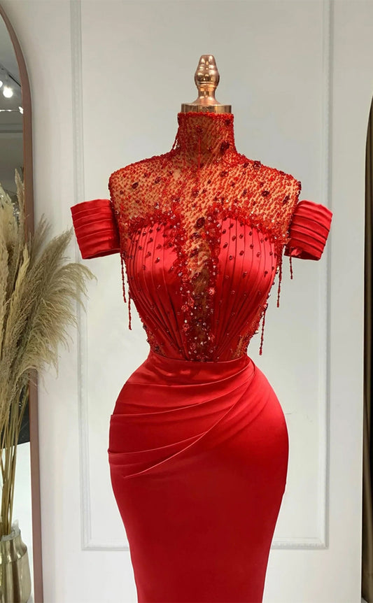 RP296-Classic Red Mermaid High Neck Beads Sequined Cap Sleeves Prom Evening Dresses Formal Party Gowns With Pleat