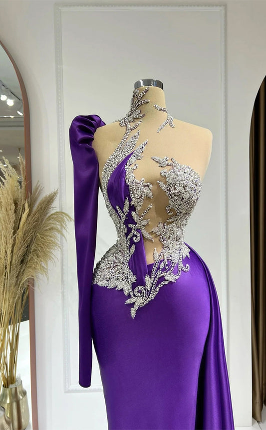 RP311-Elegant Purple Mermaid High Neck Beads Appliqued One Long Sleeve Prom Evening Dresses Formal Party Gowns With Train