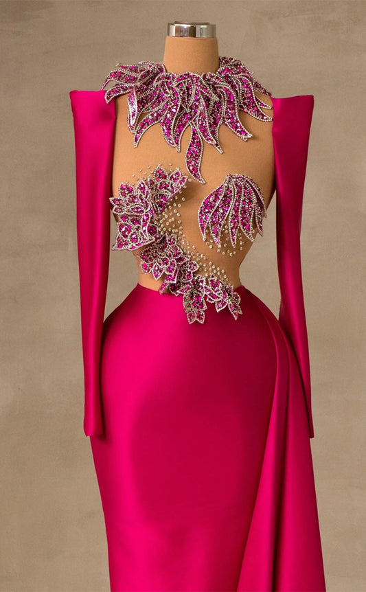 RP341-Pink Mermaid High Neck Sequins Crystals Long Sleeves Prom Evening Dresses Formal Party Gowns With Appliqued