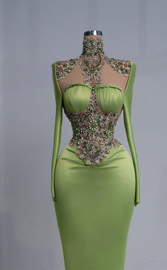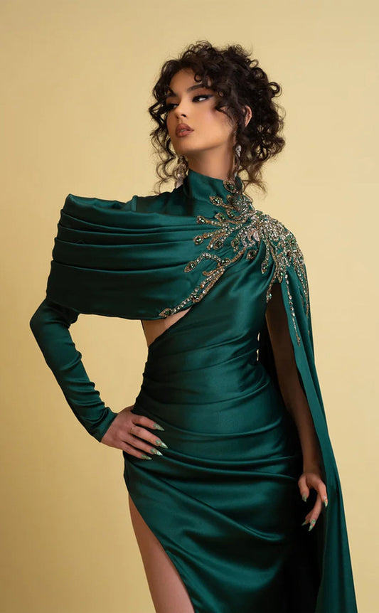 RP231-Green Mermaid High Neck Beads Pleated Long Sleeves Prom Evening Dresses Formal Party Gowns With Slit