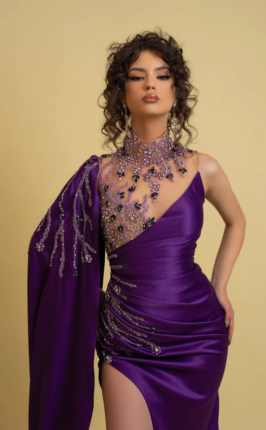 RP215-Purple Trumpet High Neck Beads Crystals Long Sleeves Prom Evening Dresses Formal Party Gowns With Slit