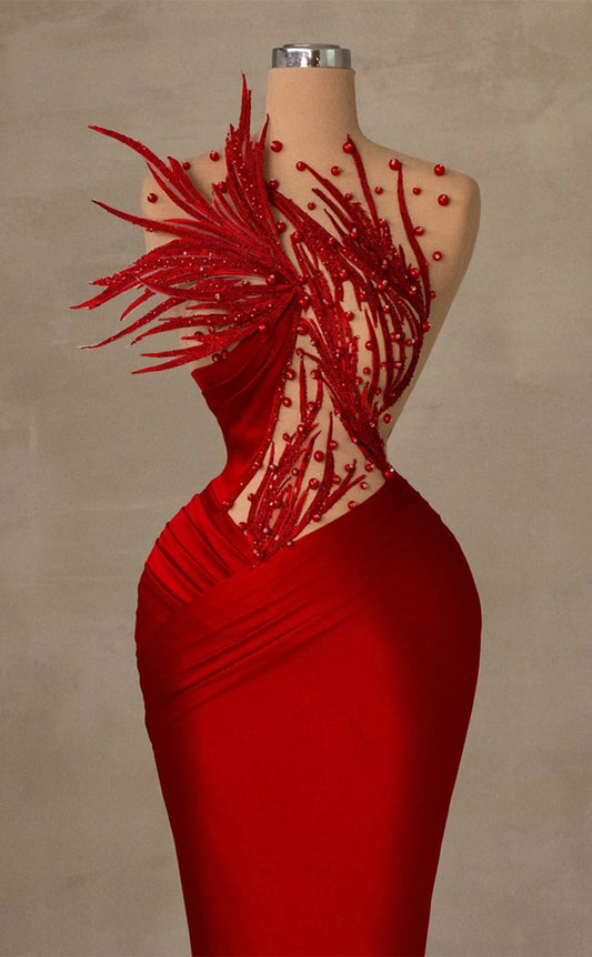RP218-Red Trumpet Sheer Neck Beads Feather Long Prom Evening Dresses Formal Party Gowns With Pleated