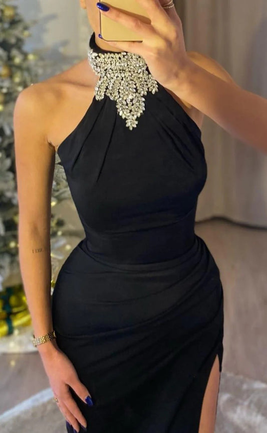 RP955-Elegant Black Mermaid High Neck Crystals Sleeveless Prom Evening Dresses Formal Party Gowns With Slit