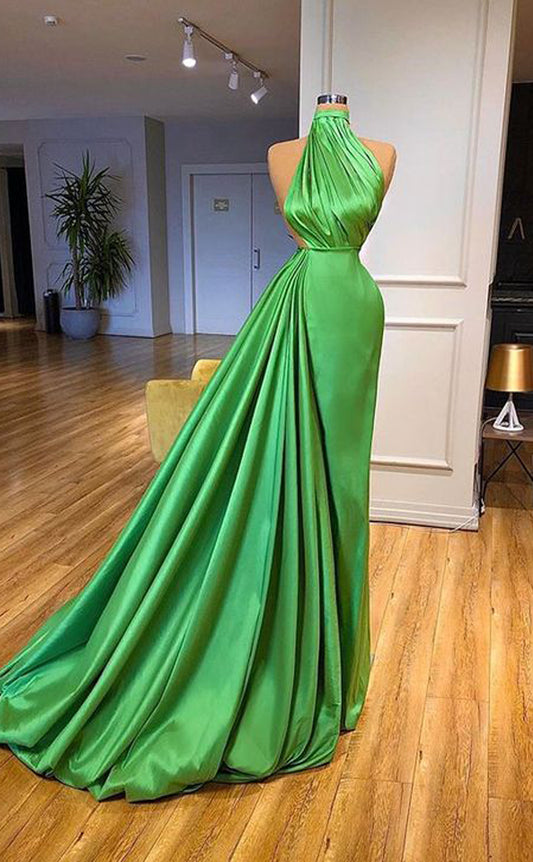 RP1155-Elegant Green Mermaid High Neck Ruched Sleeveless Satin Long Prom Evening Dresses Formal Party Gowns With Train