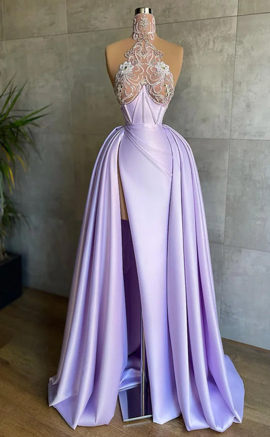 RP1129-Elegant Lavender Mermaid High Neck Beads Appliqued Sleeveless Satin Long Prom Evening Dresses Formal Party Gowns With Slit