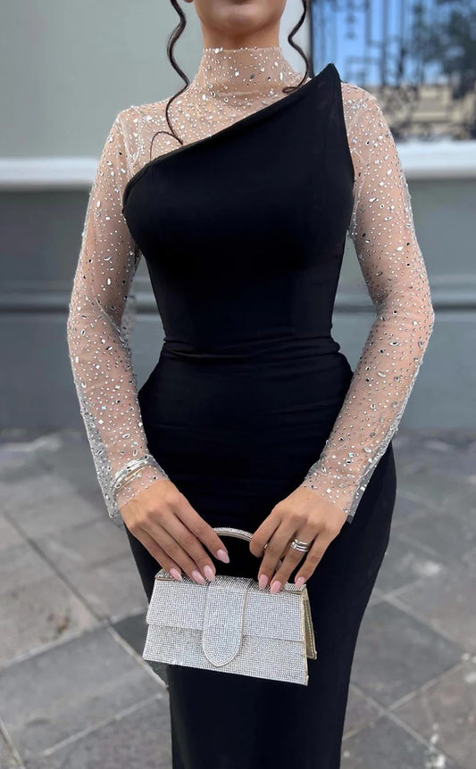 RP956-Elegant Black Mermaid High Neck Crystals Beads Long Sleeves Prom Evening Dresses Formal Party Gowns