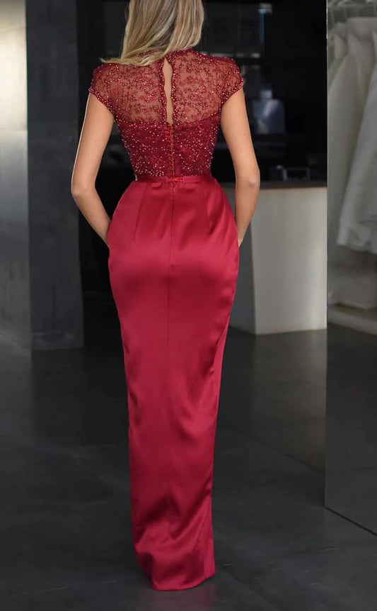 RP1077-Elegant Red Mermaid High Neck Beads Appliqued Sleeveless Long Prom Evening Dresses Formal Party Gowns With Slit