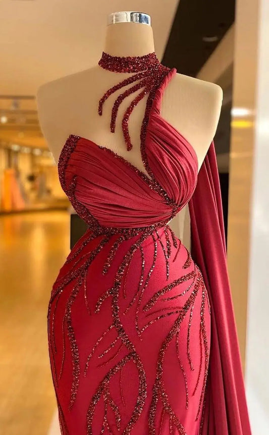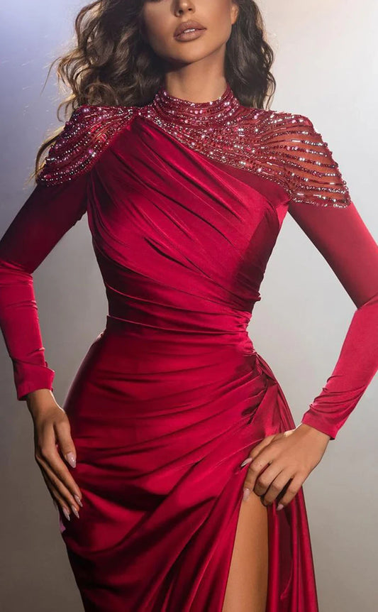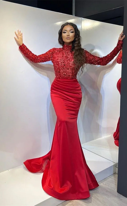 RP704-Eleagnt Red Mermaid High Neck Beads Sequins Long Sleeves Prom Evening Dresses Formal Party Gowns