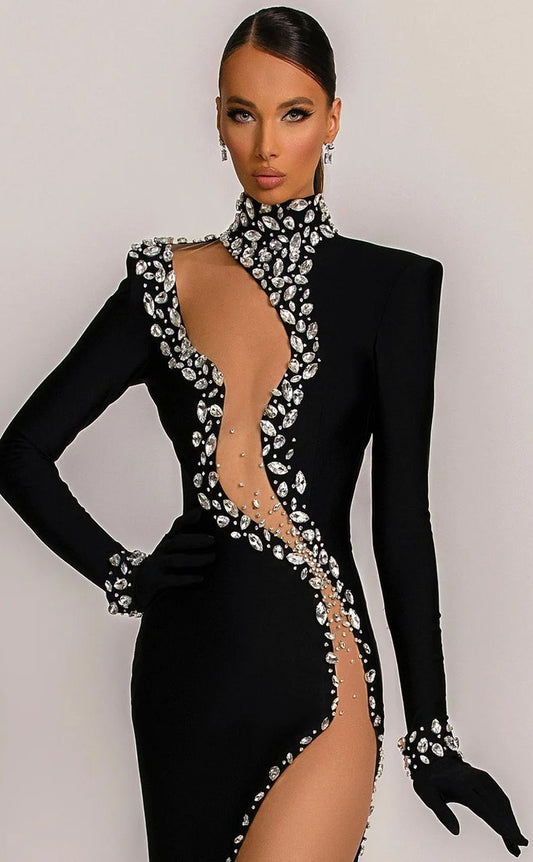 RP724-Gorgeous Black Mermaid High Neck Crystals Beads Long Sleeves Satin Prom Evening Dresses Formal Party Gowns With Slit