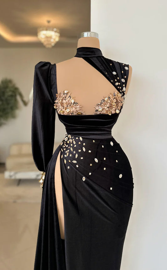 RP577-Elegant Black Mermaid High Neck Beads Long Sleeves Velvet Long Prom Evening Dresses Formal Party Gowns With Slit