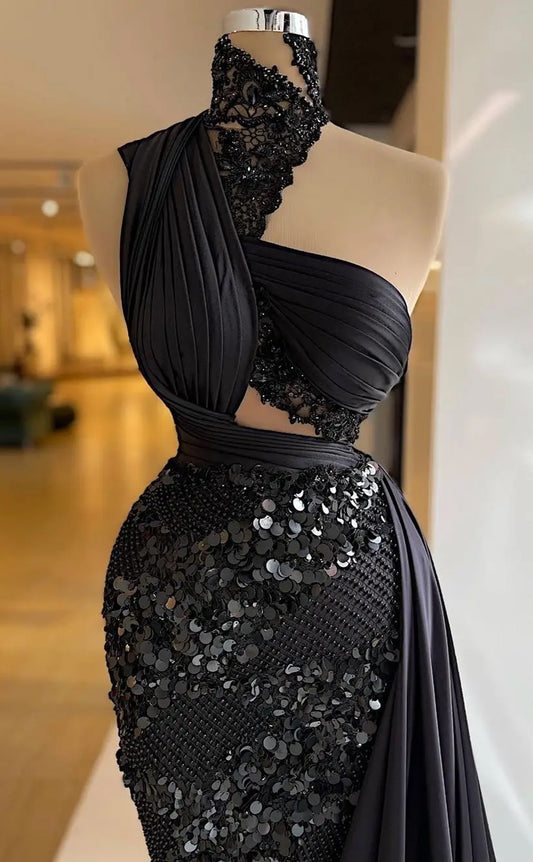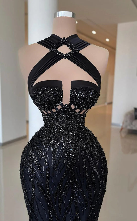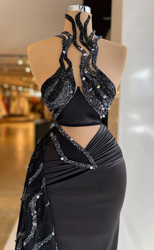 RP625-Gorgeous Black Mermaid High Neck Sequins Ruched Beaded Sleeveless Long Prom Evening Dresses Formal Party Gowns