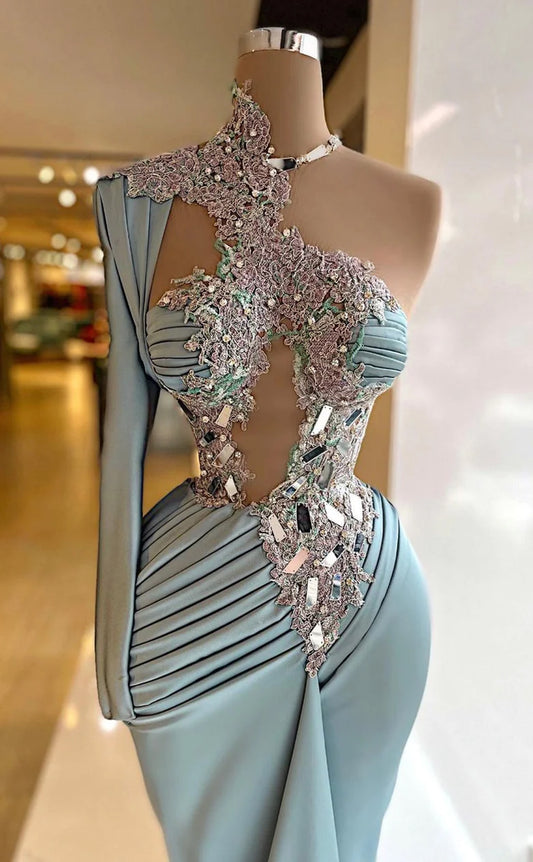 RP571-Gorgeous Mint Mermaid High Neck Beads Pearls Long Sleeves Floor Length Prom Evening Dresses Formal Party Gowns