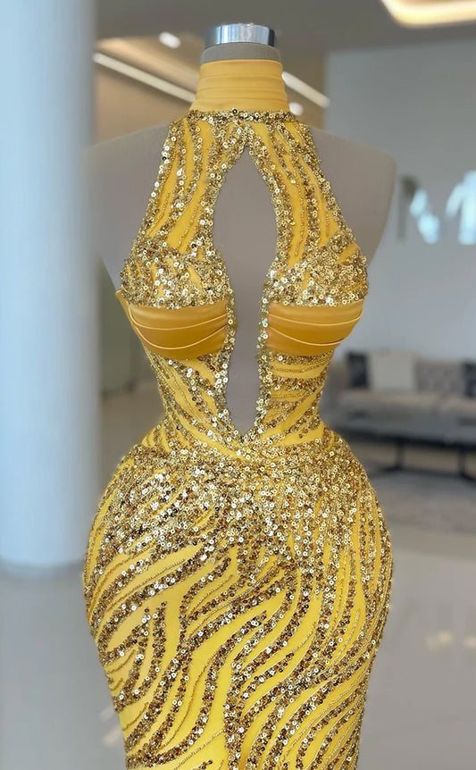 RP652-Sparkling Yellow Mermaid High Neck Sequins Beaded Sleeveless Floor Length Prom Evening Dresses Formal Party Gowns