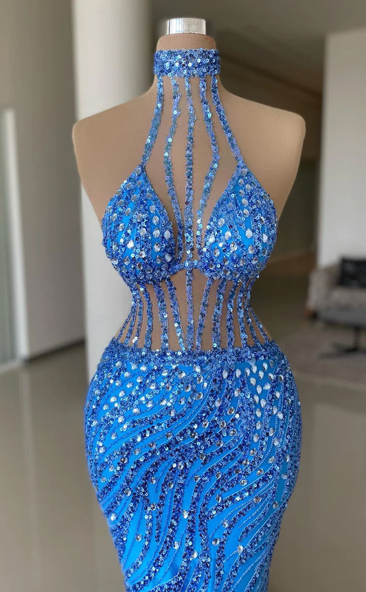 RP650-Sparkling Sky Blue Mermaid High Neck Sequins Crystals Sleeveless Floor Length Prom Evening Dresses Formal Party Gowns