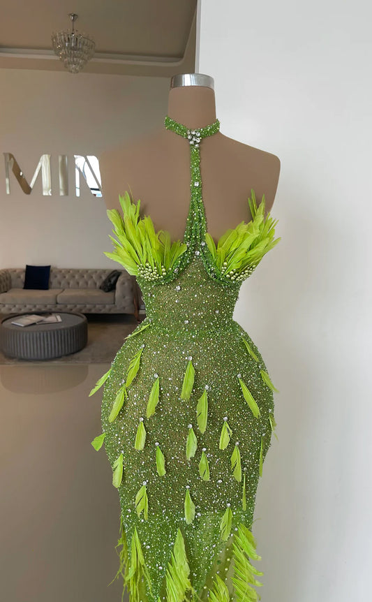 RP663-Sparkling Green Mermaid High Neck Beads Crystals Feathers Sleeveless Floor Length Prom Evening Dresses Formal Party Gowns
