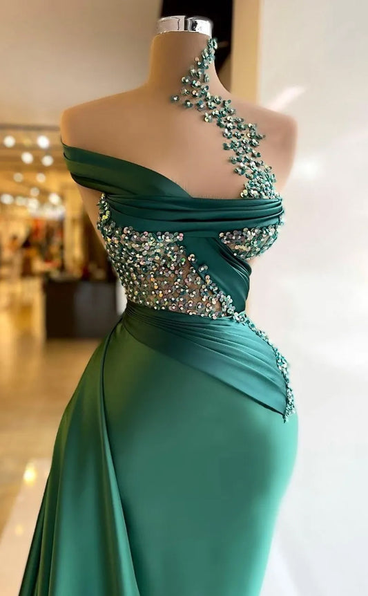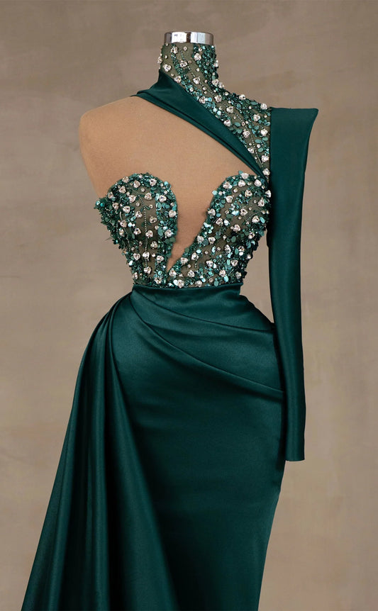 RP488-Luxury Green Mermaid High Neck Beads Sequins Ruched Crystals Long Sleeves Satin Prom Evening Dresses Formal Party Gowns